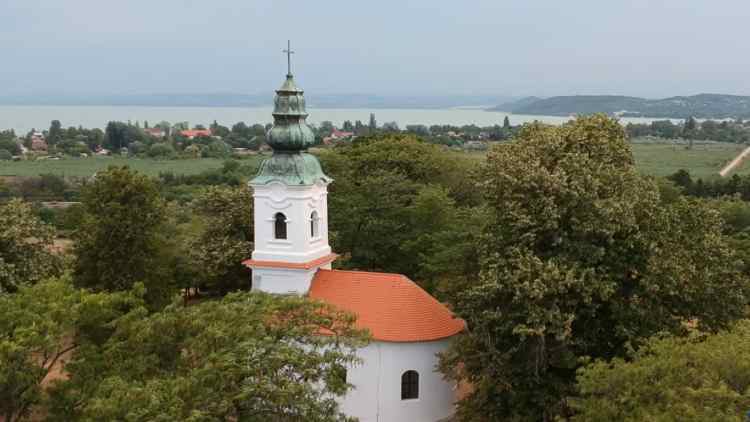A kápolna mellől csodálatos kilátás nyllik a Tihanyi-félszigetre, és a Balatonra Badacsonytól egészen Balatonfüredig. Jól lehet látni a Tihanyi-félszigeten lévő kéttornyú apátsági templomot is, a háttérben pedig a külső–somogyi dombok és erdők látványa varázsolja el a látogatókat. A templom szép kis templom bejárata előtt llóévő tölgyfából faragott missziós keresztet majd szááz éve 1925-ben állították.