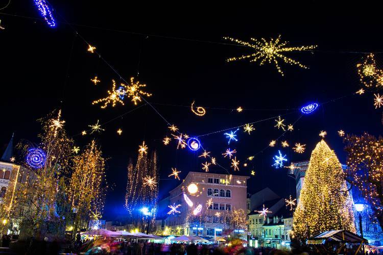 Ljubljana idén november 25-én ölti fel karácsonyi díszeit: ekkor gyúlnak fel az adventi fények, ettől kezdve az utcákon karácsonyi dallamok csendülnek fel, árusok kínálják portékájukat, és forralt bor, pirított mandula illata lengi be a várost.