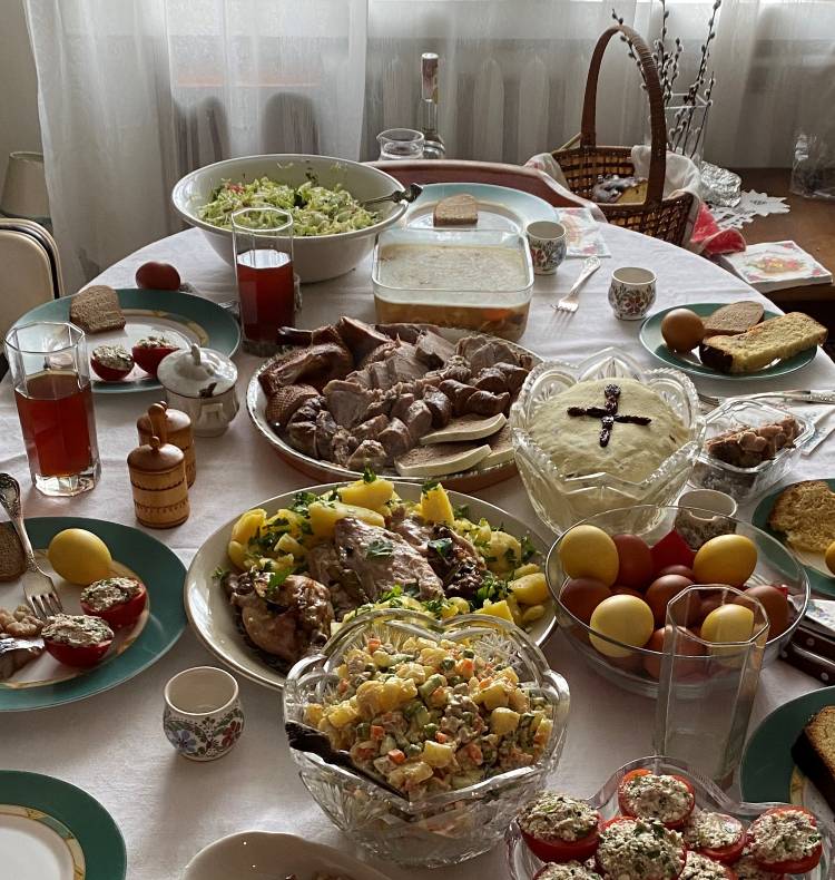 Az ukrán nép egyébként nem túlságosan vallásos. Az ország nyugati részén többet járnak templomba, jobban betartják a szabályokat, de a Kijev környékén lakóknak a Karácsony, a Vízkereszt, a Virágvasárnap, a Húsvét inkább szép hagyomány. A Húsvét különösen népes – az idén, a karantén ellenére is meglepően sokan mentek templomba. Idősek, fiatalok. Nők – akiknek a fejkötő még kötelező (bár ez nem az ukrán, hanem inkább az orosz egyházra jellemző szabály), szoknya viszont már nem, férfiak – sapka nélkül (jó, hogy az idén késői a Húsvét, nincs hideg). Egyedül, családostul - csinos terítőkkel letakart kosárkákkal a kezükben. Vannak olyanok, akik bemennek misére, de többen inkább a templom udvarában maradnak. Felsorakoznak, földre teszik a kosárkákat, felhajtják a terítőket – lám itt van a húsvéti ételek sokasága! A „kötelező program” a pászka (amit kalácsnak szoktak fordítani, de ízre az inkább kuglóf), és a festett/hímes tojás, só, valamilyen hús és/vagy kolbászféle, ezen kívül túrós pászka, torma… A pászka egyébként olyan fontos dolog, hogy kisebb városokban pár nappal Húsvét előtt már nem is lehet kapni sima kenyeret: a kenyérgyárak teljes egészében a pászkasütésre állnak át. Manapság általában fehérmázzal, színes cukorszórással díszítik őket, én pedig tésztából gyúrt keresztet, mérettől függően – ha elférnek - „kacsákat”, leveleket formálok a tetejére és cukros tojássárgájával kenem be. A nagymamám és az anyukám is így csinálták.